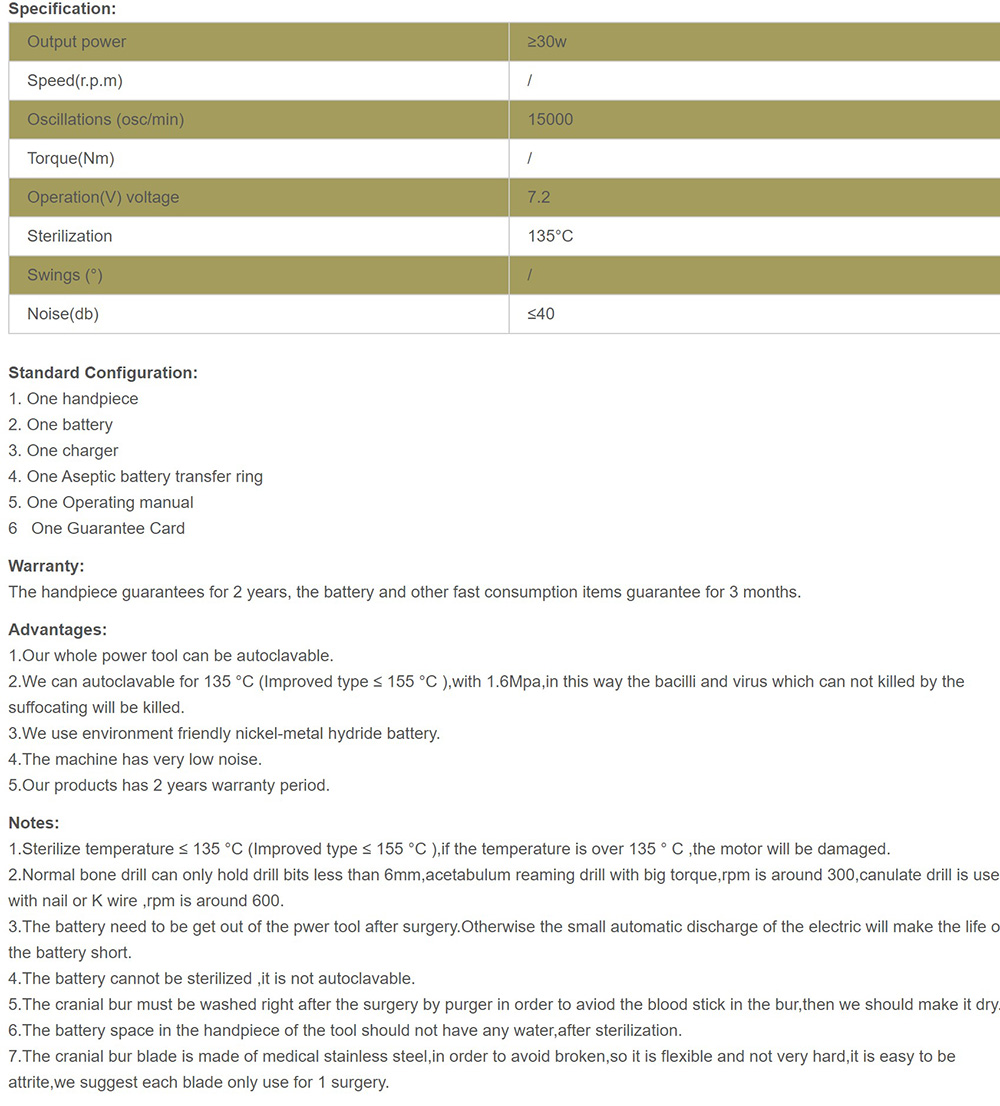 With the perfect shape of ergonomic design,whole unit is autoclavable,motor is imported,low noise, steadily and quickly cutting,no damage for soft tissue,long service life,be warranty for 2 years.A variety of different thickness or the length of the saw blade for your selection .Common length are 70mm,90mm and 100mm,common thickness are 0.8mm,1.0mm,1.2mm and 1.27mm,saw blade also can be customized according to your request.
